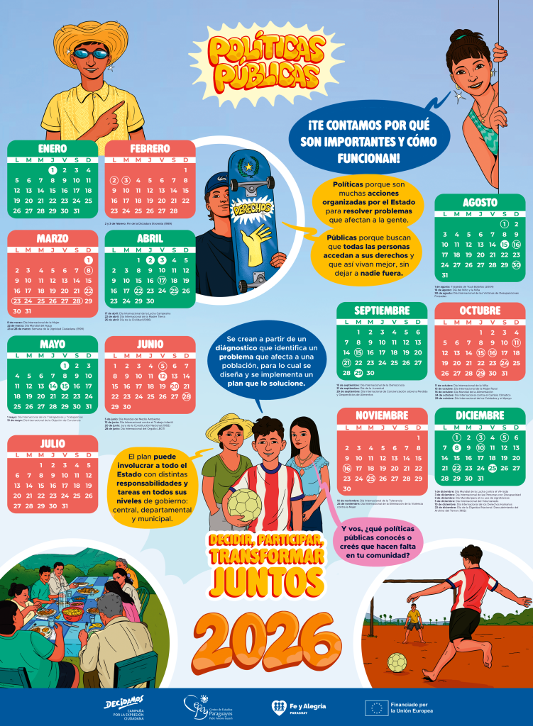 Este calendario 2026 de Voz Activa combina información práctica con contenidos educativos para acercar a las juventudes al concepto de políticas públicas y su importancia en la vida cotidiana. A lo largo del año, el calendario explica de forma sencilla qué son las políticas públicas, por qué no son favores sino responsabilidades del Estado, y cómo se crean a partir de diagnósticos, decisiones e implementación de acciones para resolver problemas que afectan a la comunidad. Además, resalta el rol de la participación ciudadana —especialmente de las y los jóvenes— para decidir, participar y transformar colectivamente, promoviendo una mirada activa sobre los derechos y la vida en comunidad.